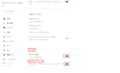 https化は、管理画面の「カスタムドメイン」の下にある「HTTPS」の[HTTPSの使用」と「HTTPSリダイレクト」の2個をオンにする。